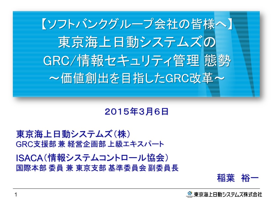 - ソフトバンクグループ会社の皆様への講演「東京海上日動システムズの GRC/情報セキュリティ管理 態勢 ~価値創出を目指したGRC改革~」